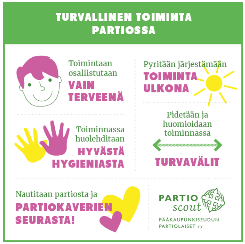 Noudatamme toiminnassa muun muassa Suomen Partiolaisten ja Pääkaupunkiseudun Partiolaisten ohjeistuksia, jotka pohjautuvat valtioneuvoston sekä muiden viranomaisten linjauksiin.
